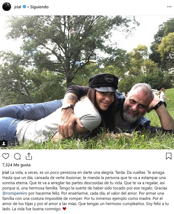 “Gracias @romipereiro por hacerme feliz. Por enseñarme, cada día, el valor del amor. Por armar una familia con una costura imposible de romper. Por tu inmenso ejemplo como madre. Por el amor de tus hijas y por el amor a las mías. Que tengas un hermoso cumpleaños. Soy feliz a tu lado. La vida fue buena conmigo ❤️“, escribió Jorge en la red social.