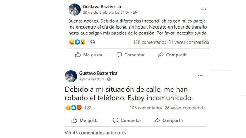 El pasado martes 28 de diciembre, Bazterrica escribió un desesperante mensaje público en su cuenta de Facebook: “Buenas noches. Debido a diferencias irreconciliables con mi ex pareja, me encuentro al día de fecha, sin hogar. Necesito un lugar de tránsito hasta que salgan mis papeles de la pensión. Por favor, necesito ayuda”.
