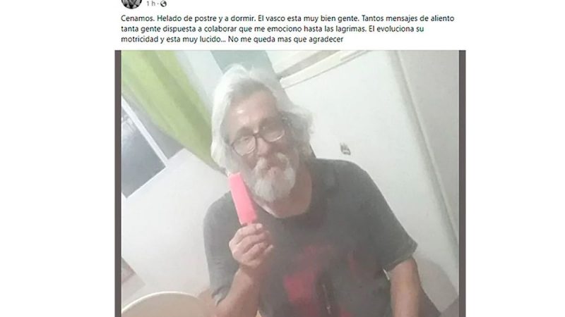 Luego, llegó el turno de otro mensaje de Bazterrica muy preocupante: “Debido a mi situación de calle, me han robado el teléfono. Estoy incomunicado”. Y ahí Bustos relató que le dio alojamiento y comida por unos días: “Por ahora esta en mi casa le estoy dando transito por unos días. Si necesitan hablar con él, les paso mi celular. Cenamos. Helado de postre y a dormir. El Vasco está muy bien, gente. Tantos mensajes de aliento, tanta gente dispuesta a colaborar que me emociono hasta las lagrimas. Él evoluciona su motricidad y está muy lúcido… No me queda mas que agradecer. Quiero agradecer a Gastón Castro y Carlos Enciso que se prestaron para cuidarlo mientras yo trabajaba, dejando de lado sus familias y quehaceres. Eternamente gracias, ellos también son parte. Seamos parte todos”.