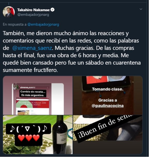 De acuerdo a lo que contó en cuenta oficial de Twitter, el diplomático japonés realizó una encuesta en sus redes sociales sobre platos argentinos y una de las opciones ganadoras fueron las milanesas: “En Argentina, donde la mayoría de los inmigrantes son italianos, parece que se ha consolidado como un plato local, y hay infinidad de recetas y videos. Fue medio día de cocina divertida”.