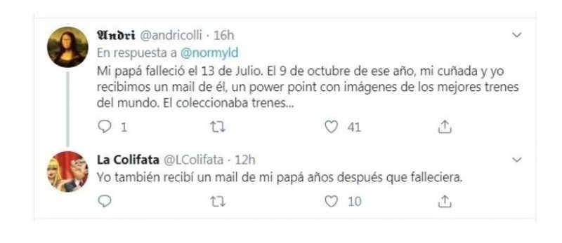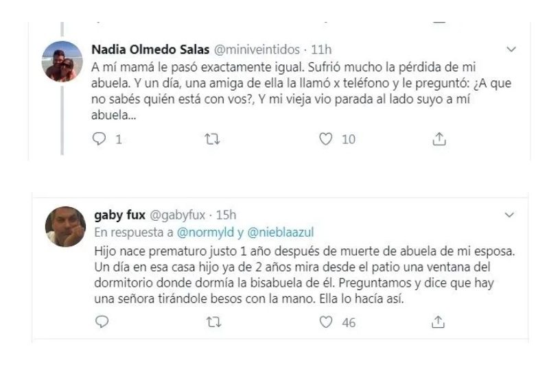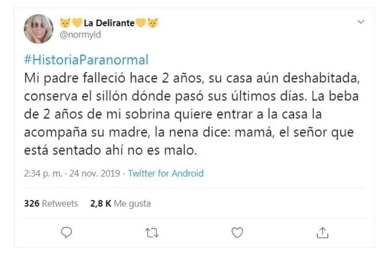 “Mi padre falleció hace 2 años, su casa aún deshabitada, conserva el sillón dónde pasó sus últimos días. La beba de 2 años de mi sobrina quiere entrar a la casa la acompaña su madre, la nena dice: mamá, el señor que está sentado ahí no es malo” reveló el escalofriante tuit de @normyld y acto seguido miles y miles de comentarios reflejaron escalofriantes casos.