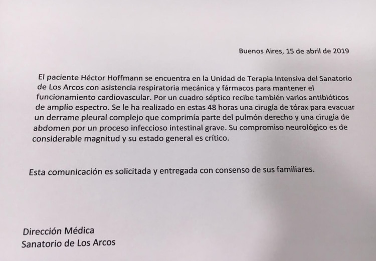 “Su compromiso neurológico es de considerable magnitud y su estado general es crítico”, finaliza el parte médico que Federico Hoffmann -hijo del cantante- compartió a través de su cuenta de Twitter, red social en la cual pidió ayuda a sus seguidores. “Sigamos haciendo fuerza. Juntos”, escribió quien también es músico.