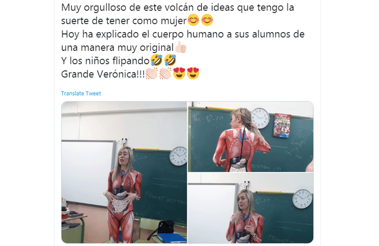 La primera imagen que se hizo viral mostraba a la profesora con un body en el que llevaba puesto, con los órganos del cuerpo humano estampados, para que así fuese más sencillo para sus alumnos identificarlos y recordarlos.
