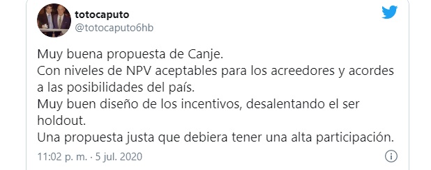 “Muy buena propuesta de Canje. Con niveles de NPV aceptables para los acreedores y acordes a las posibilidades del país. Muy buen diseño de los incentivos, desalentando el ser holdout. Una propuesta justa que debiera tener una alta participación”, escribió el exfuncionario en su cuenta de Twitter horas después de que el Ejecutivo difundiera el contenido de la oferta.