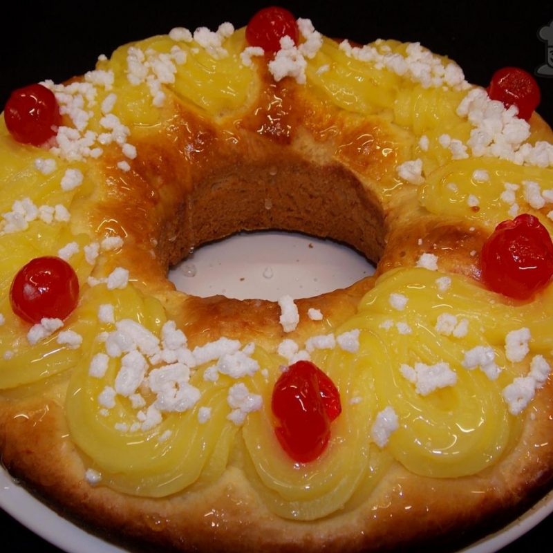 6. Decorar con crema pastelera. Pintar el resto de la rosca con huevo y llevar a horno medio por 20 a 30 minutos.