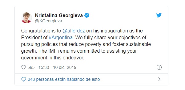 “Felicitaciones por su toma de posesión como presidente de la Argentina. Compartimos plenamente su objetivo de adoptar políticas que reduzcan la pobreza y fomenten el crecimiento sostenible. El FMI sigue comprometido a ayudar a su gobierno en este esfuerzo”, escribió Georgieva.