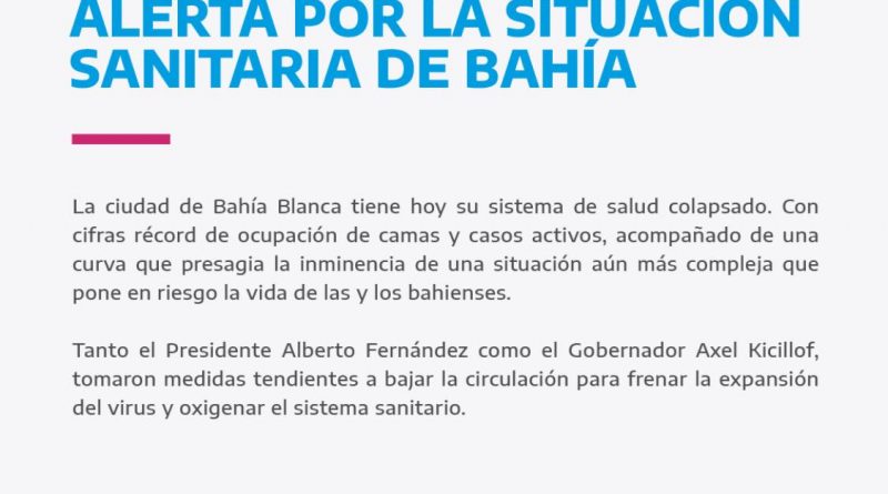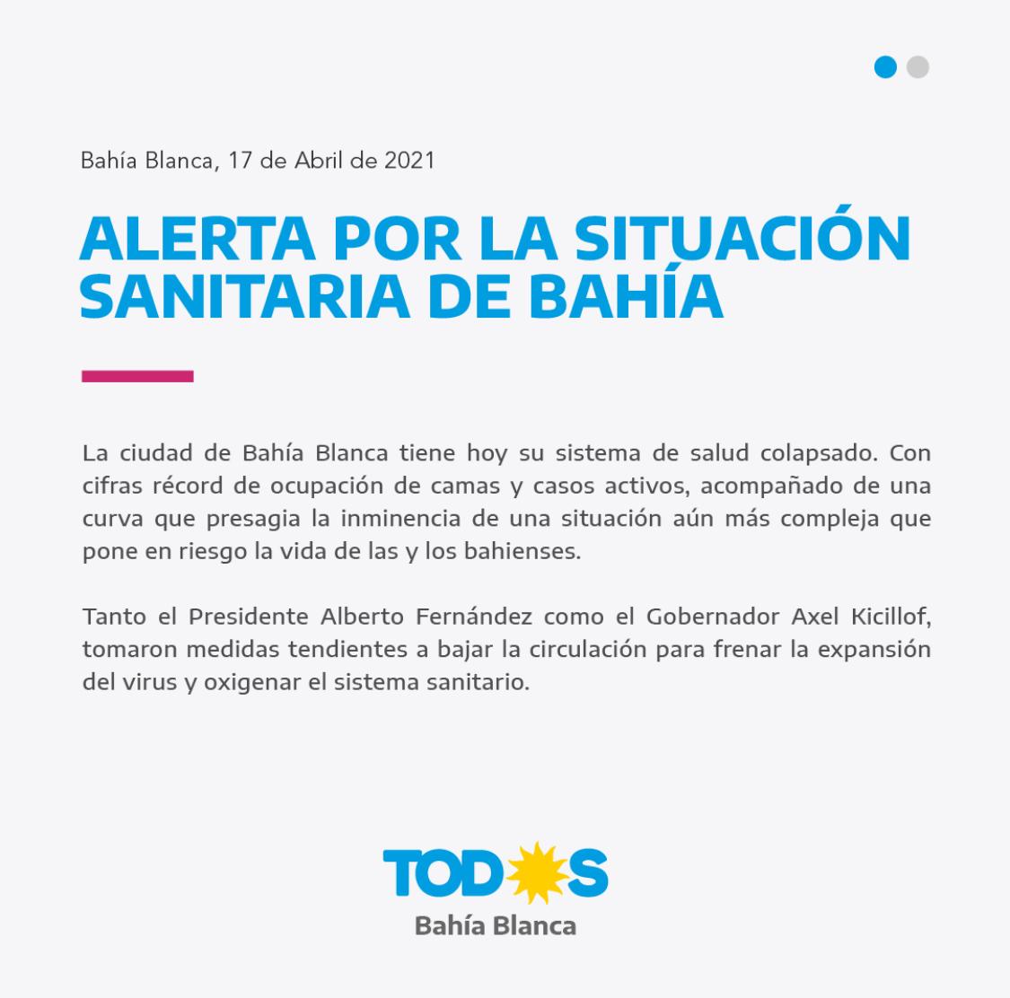 “La ciudad de Bahía Blanca tiene hoy su sistema de salud colapsado. Con cifras récord de ocupación de camas y casos activos, acompañado de una curva que presagia la inminencia de una situación aún más compleja que pone en riesgo la vida de las y los bahienses.