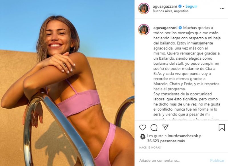 “Muchas gracias a todos por los mensajes que me están haciendo llegar con respecto a mi baja del Bailando. Estoy inmensamente agradecida, una vez más, con el mismo. Quiero remarcar que gracias a un Bailando, siendo elegida como bailarina del staff, yo pude cumplir mi sueño de poder mudarme de Córdoba a Buenos Aires, y cada vez que pueda voy a recordar mis eternas gracias a Marcelo, Chato y Fede, y mis respetos hacia el programa“, comenzó.