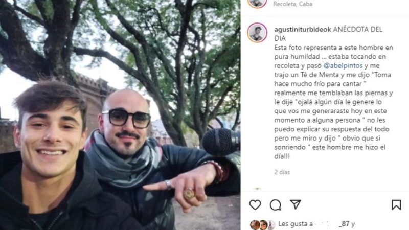 Se llama Agustín Iturbide el muchacho en cuestión, quien no dudó el pedirle un recuerdo fotográfico al talentoso cantante y compartió con sus más de 30 mil seguidores tremendo gesto solidario de Abel Pintos, bajo el título de Anécdota del día. “Esta foto representa a este hombre en pura humildad … Estaba tocando en Recoleta y pasó @abelpintos y me trajo un té de menta y me dijo ‘Tomá, hace mucho frío para cantar’“, comenzó relatando.
