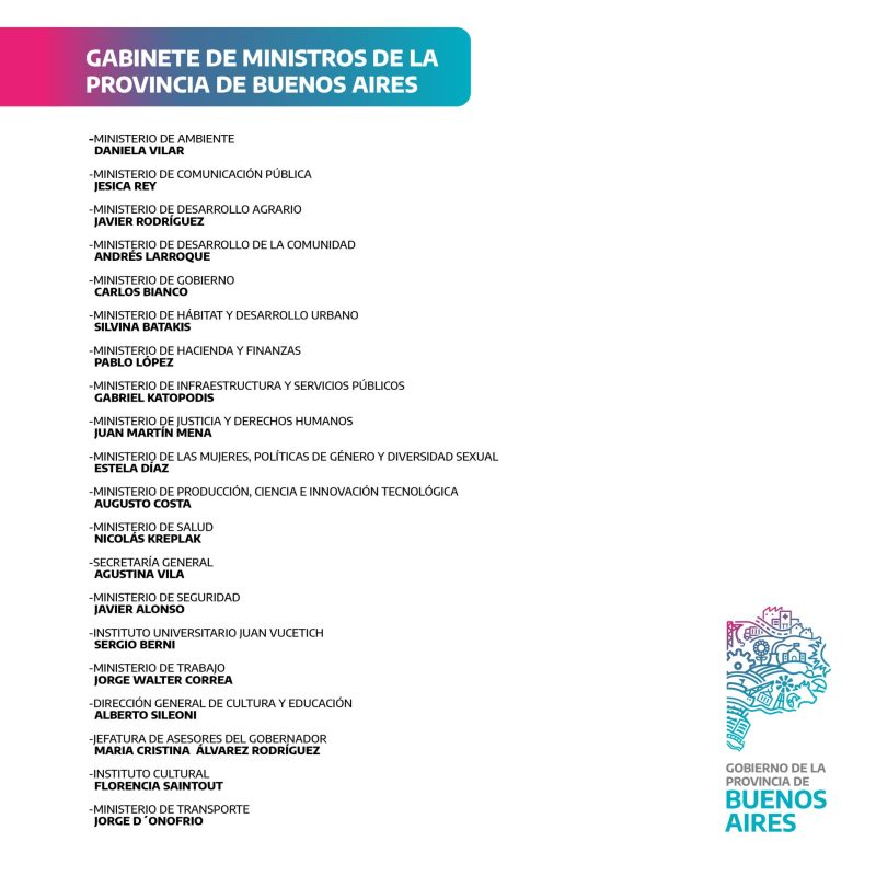 El gobernador de la provincia de Buenos Aires, Axel Kicillof, dio a conocer esta mañana los nombres de los funcionarios que integrarán su gabinete para el segundo mandato, entre quienes se encuentran muchos de los actuales ministros y, además, se suman Gabriel Katopodis, Juan Martín Mena y Silvina Batakis.