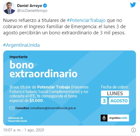 Según la cartera liderada por Arroyo la suma ya fue depositada el pasado 3 de agosto a los titulares del programa Potenciar Trabajo.