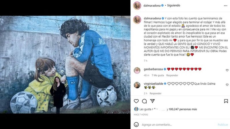 Los días pasaron y tras el rodaje de las escenas y entrevistas en Argentina, Dalma Maradona junto a todo el equipo de la docuserie viajó a Nápoles para reflejar aquella etapa de la vida de Diego Maradona en Italia. Así, en las últimas horas anunció desde sus redes sociales el fin del rodaje de La hija de Dios, con una imagen suya delante de un mural callejero con la icónica postal en la que le coloca margaritas a su papá en las medias antes de salir a la cancha. “Y con esta foto les cuento que terminamos de filmar!! Hermoso lugar elegido para terminar el rodaje!”, escribió.