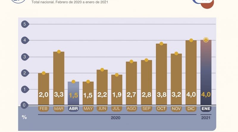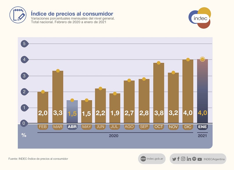 En el reporte del INDEC se indicó que el Nivel general del Índice de precios al consumidor (IPC) registró en enero de 20211 un alza de 4,0%, y acumuló en los últimos doce meses un incremento de 38,5%.
