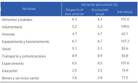 “Alimentos y bebidas”, el capítulo de mayor ponderación, registró un aumento del 6,3%. Los mayores incrementos corresponden a frutas frescas (22,0%), gaseosas (16,7%), helados (16,4%), verduras, tubérculos y legumbres en conserva (15,0%), fideos secos (14,4%), dulces (13,3%), comidas preparadas (12,1%), pescados y mariscos (11,9%), verduras, tubérculos y legumbres frescas (11,5%), pan fresco (10,2%) y soda y agua mineral (9,3%)