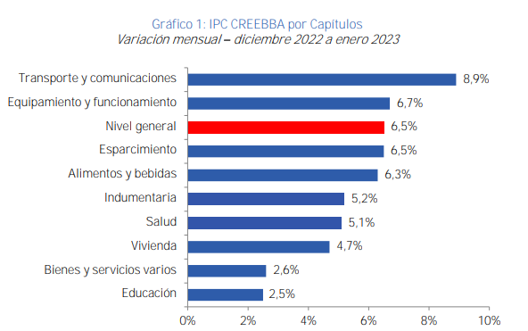 El Índice de Precios al Consumidor (IPC) elaborado por el Centro Regional de Estudios Económicos de Bahía Blanca (CREEBBA) aumentó un 6,5%, presentando una aceleración respecto al mes de diciembre.