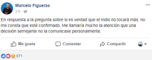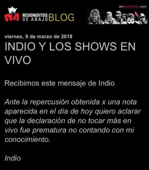 Sin embargo, al parecer Sáez se apresuró al dar esta noticia y fue el propio compositor quien salió a desmentir los dichos de su manager. A través de un blog, El Indio publicó un mensaje donde asegura que estas declaraciones fueron apresuradas. “Quiero aclarar que la declaración de no tocar más en vivo fue prematura, no contando con mi conocimiento”, expresó.