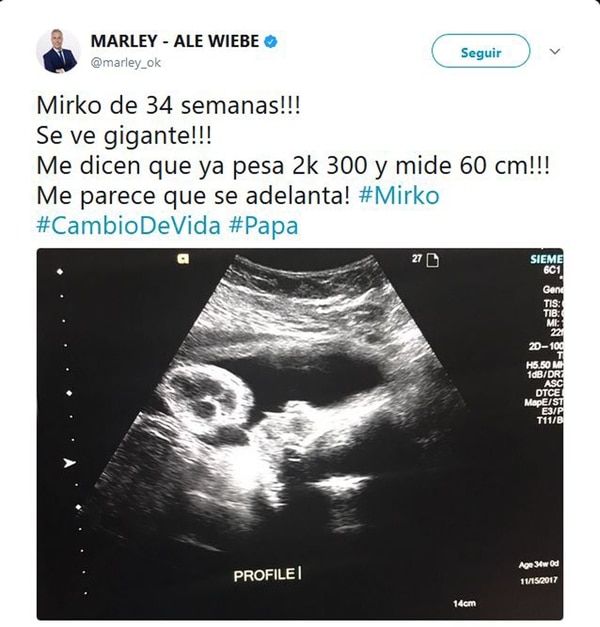 A pesar de la distancia con la mujer que está gestando a su hijo, Marley sigue muy de cerca el embarazo y publica en Twitter imágenes de los estudios médicos y algunos datos del pequeño. “Mirko de 34 semanas, ¡se ve gigante! Dicen que ya pesa 2,300 kgs y mide 60 cms. ¡Parece que se adelanta!”, escribió el conductor.