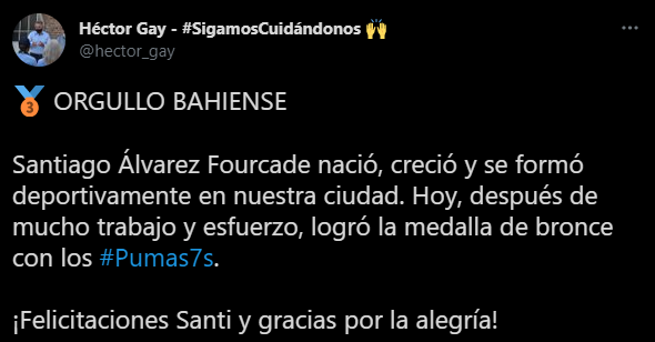 “Santiago Álvarez Fourcade nació, creció y se formó deportivamente en nuestra ciudad. Hoy, después de mucho trabajo y esfuerzo, logró la medalla de bronce con los Los Pumas ‘7”, señaló el intendente Héctor Gay, al referirse la primera presea de la delegación albiceleste en los Juegos Olímpicos Tokio 2020, al imponerse en el duelo por el tercer puesto a su par de Gran Bretaña, por 17-12.