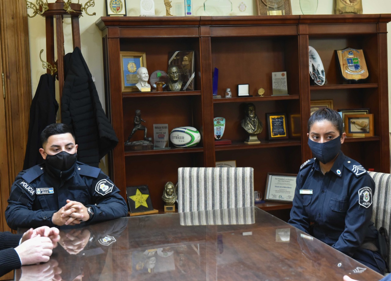 El intendente Héctor Gay recibió en su despacho a los efectivos policiales Ana Inostroza y Ricardo Sosa, quienes el pasado 18 de junio encabezaron el procedimiento que permitió la detención de dos personas que poseían armas, drogas y una importante suma de dinero.