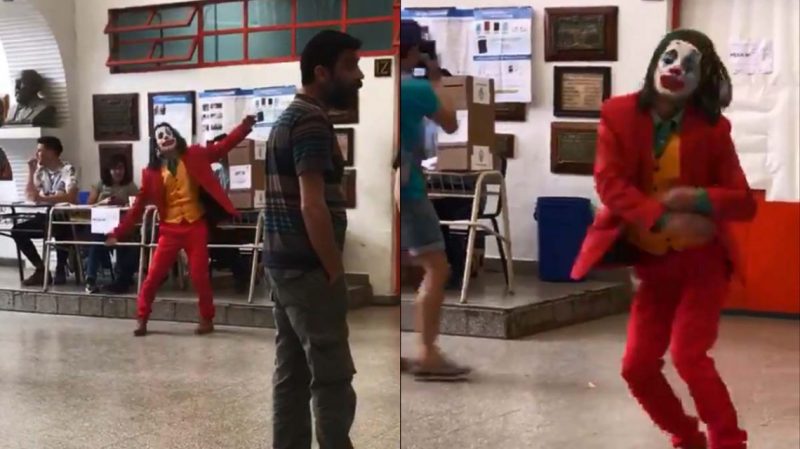 Quizás como una crítica a la política o al sistema democrático, el “Bromas”, o Joker, votó, rió y bailó a la salida del cuarto oscuro, con su traje rojo, su maquillaje corrido y su pelo verde característicos.