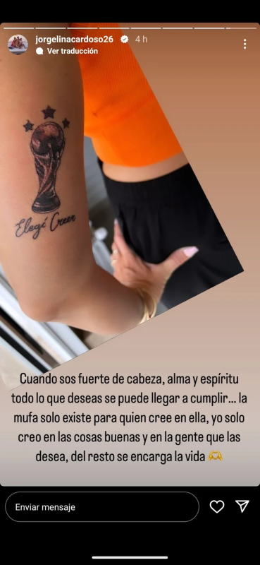 La pareja del jugado se tatuó la Copa del Mundo junto a las tres estrellas y la siguiente frase: “Elegí creer”.