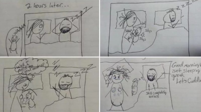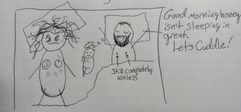 El marido duerme y ella cría a la beba: con dibujitos le explicó por qué está tan cansada