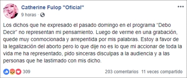 Después de la notable repercusión que tuvo su participación en el ciclo de América, en la madrugada de este martes Catherine volcó sus disculpas con un escrito que publicó en las redes. “Luego de verme en una grabación, quedé muy conmocionada y arrepentida por mis palabras”, dijo en un posteo realizado tanto en su cuenta de Twitter (lo dejó fijado) como en Facebook.