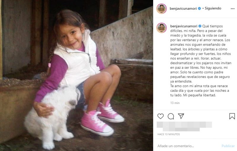 Por último, expresó: “No hay apuro, mi amor. Solo te cuento como padre pequeñas revelaciones que de seguro ya entendiste.Te amo con mi alma rota que renace cada día y que vuela por las noches a tu lado. Mi pequeña libertad“.
