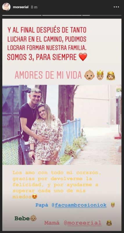 Horas después, aparentemente más calmada, Morena escribió junto a una foto con Ambrosioni, quien acaricia la pancita de la joven: “Y al final, después de tanto luchar en el camino, pudimos lograr formar nuestra familia. Somos tres, para siempre. Amores de mi vida”.