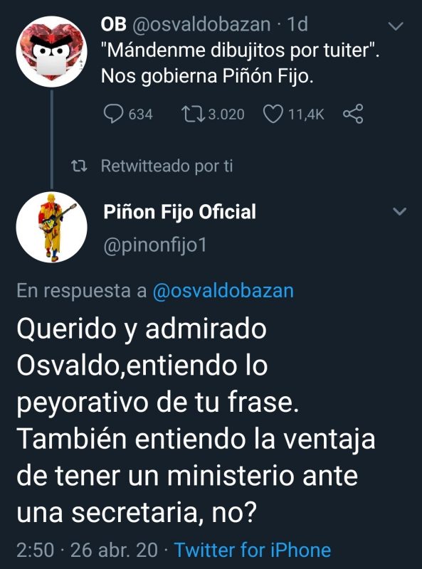 En este caso la polémica sucedió luego de que durante su última conferencia, el presidente de la Nación le pidió a los chicos que se queden en su casa, que dibujen y que le envíen lo que hagan vía redes sociales. A Bazán esto le pareció muy mal y lo hizo saber con un tweet que decía. “´Mándenme dibujitos por twitter`, nos gobierna Piñón fijo. Quien recogió el guante obviamente no fue el presidente, sino el famoso payaso cordobés, que le respondió con un comentario: “Querido y admirado Osvaldo, entiendo lo peyorativo de tu frase. También entiendo la ventaja de tener un ministerio ante una secretaría, no”, en obvia alusión a que durante la gestión de Cambiemos el Ministerio de Salud fue degradado a secretaría, hecho que Alberro Fernández al asumir, revirtió.
