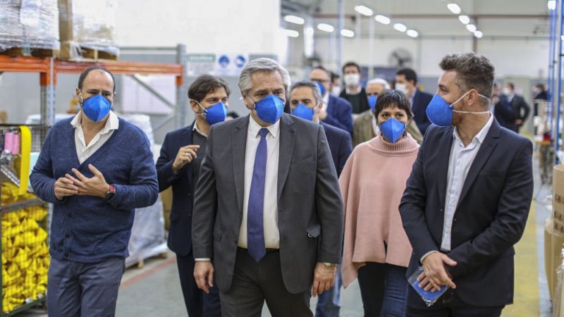 Al finalizar la recorrida, Fernández se dirigió con Kicillof a la planta Delta Plus, que está fabricando barbijos y protectores visuales utilizados para evitar contagios.