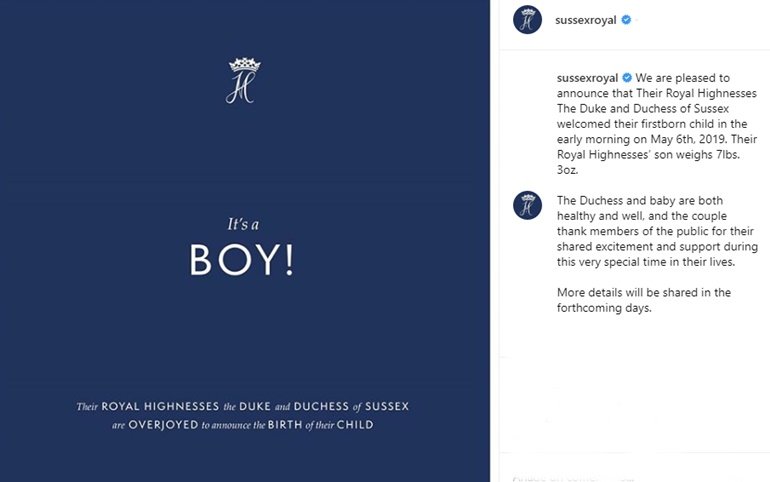“Nos sentimos felices de anunciar que Sus Altezas Reales el Duque y la Duquesa de Sussex le dieron la bienvenida a su primer hijo temprano en la mañana del 6 de mayo de 2019. El hijo de sus Altezas Reales pesa 3,260 kilos. La Duquesa y el bebé se encuentran bien y en buen estado de salud, y la pareja agradece a la gente por su entusiasmo compartido y apoyo durante este momento muy especial en sus vidas. Se brindarán más detalles en los próximos días”.