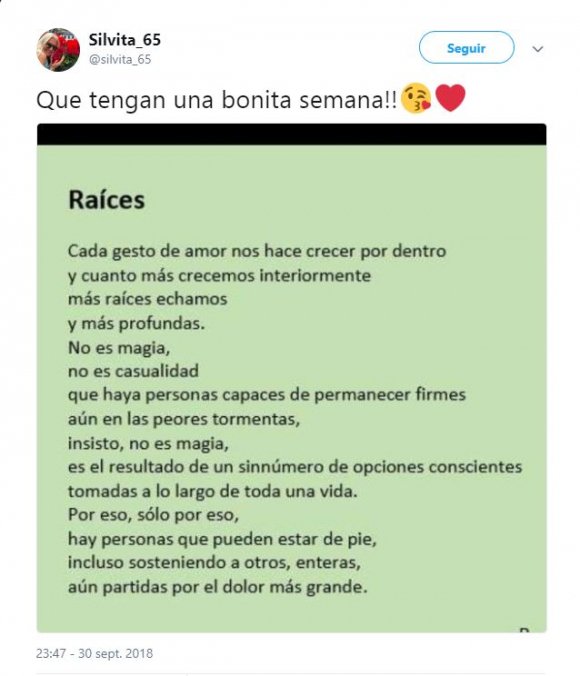 En medio de la noticia del embarazo, Silvia D’Auro recurrió a su cuenta personal de Twitter para publicar un profundo mensaje. “Cada gesto de amor nos hace crecer por dentro, y cuánto más crecemos interiormente, más raíces echamos y más profundas. No es magia, no es casualidad que haya personas capaces de permanecer firmes aun en las peores tormentas, insisto, no es magia, es el resultado de un sin número de opciones conscientes tomadas a lo largo de toda una vida. Por eso, sólo es eso, hay personas que pueden estar de pie, incluso sosteniendo a otros, enteras, aún partidas por el dolor más grande”, reza la imagen que compartió la madre de Morena y ex esposa del conductor.