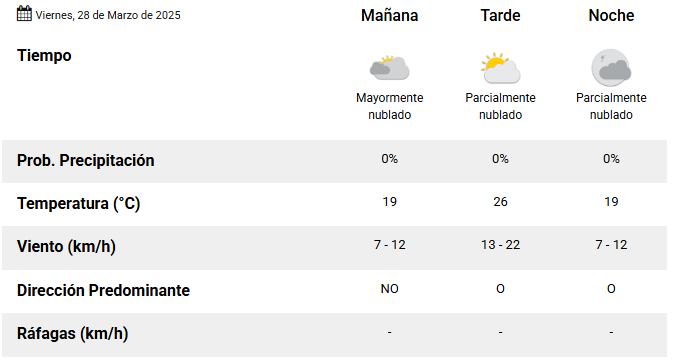 El Servicio Meteorológico Nacional informó que este viernes 28 de marzo se presentará en Bahía Blanca con cielo mayormente nublado por la mañana y parcialmente nublado por la tarde y la noche.