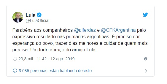 “Felicito a lo compañeros por el expresivo resultado en las primarias argentinas. Es necesario dar una esperanza al pueblo, llevar días mejores y ocuparse de quienes más lo necesitan”,escribió Lula en Twitter.