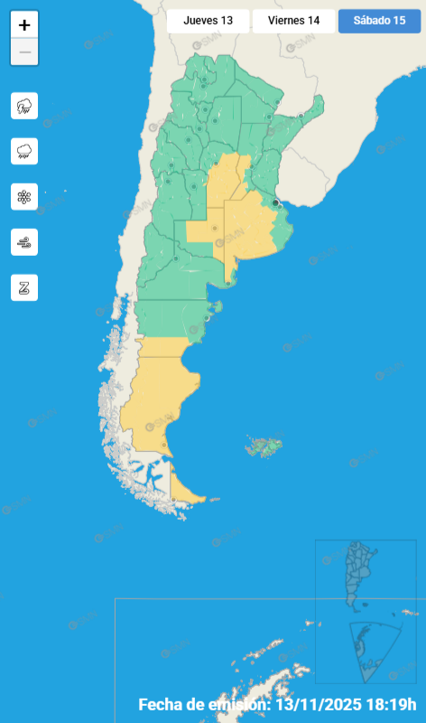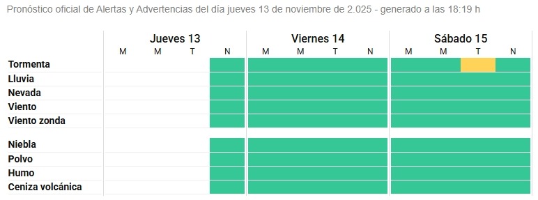 El área será afectada por lluvias y tormentas de variada intensidad, algunas localmente fuertes, que podrán estar acompañadas por abundante caída de agua en cortos períodos, frecuente actividad eléctrica, granizo e intensas ráfagas que puede alcanzar los 90 km/h.