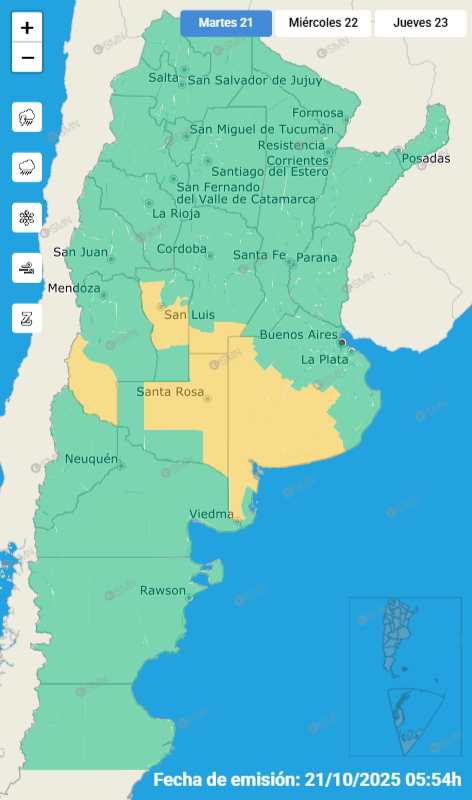 “El área será afectada por tormentas, algunas localmente fuertes. Se espera que las mismas puedan estar acompañadas por abundante caída de agua en cortos períodos, frecuente actividad eléctrica, granizo y ráfagas intensas que podrían alcanzar los 80 km/h”, detalló el organismo.