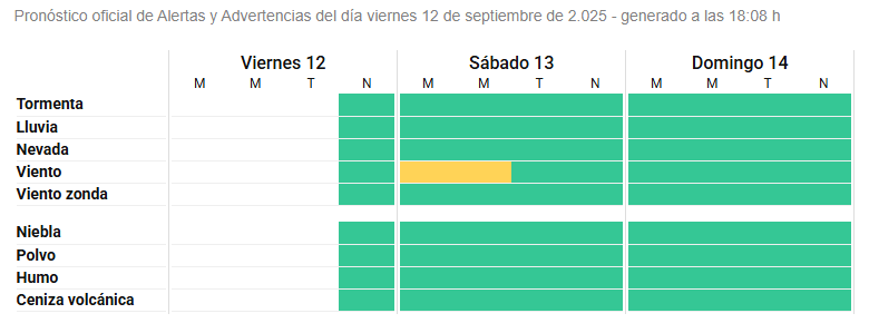 El área será afectada por vientos del sector norte, con velocidades entre 35 y 45 km/h y ráfagas que pueden alcanzar los 75 km/h, rotando al sector sur durante la tarde del sábado 13 de septiembre, señala el informe difundido esta tarde.