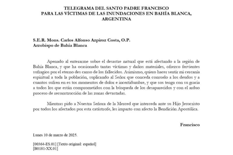 Nacionales El telegrama que envió el papa Francisco para las víctimas de las inundaciones en Bahía Blanca 10 marzo, 2025 De La Bahía Noticias Comentarios