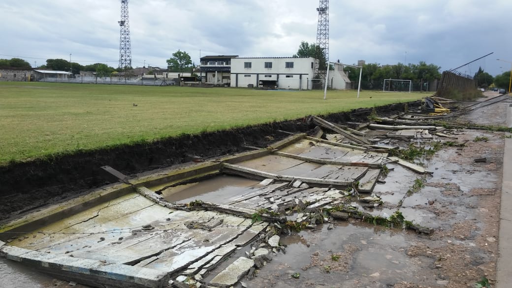 En la cancha de El Nacional el viento tiró abajo unos 30 metros del paredón ubicado detrás de uno de los arcos, sobre la calle Mazzini.