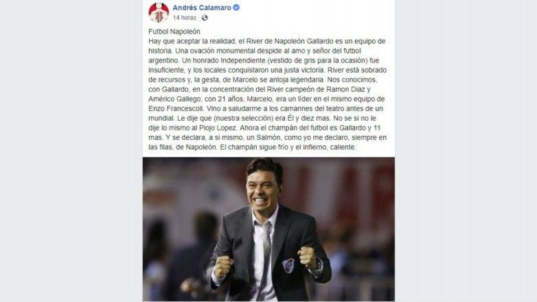 Andrés Calamaro publicó un texto en su cuenta de Facebook elogiando a Marcelo Gallardo, técnico de River Plate.