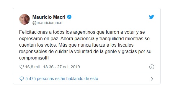 “Felicitaciones a todos los argentinos que fueron a votar y se expresaron en paz. Ahora paciencia y tranquilidad mientras se cuentan los votos”, tuiteó el presidente Mauricio Macri a las 18.36.