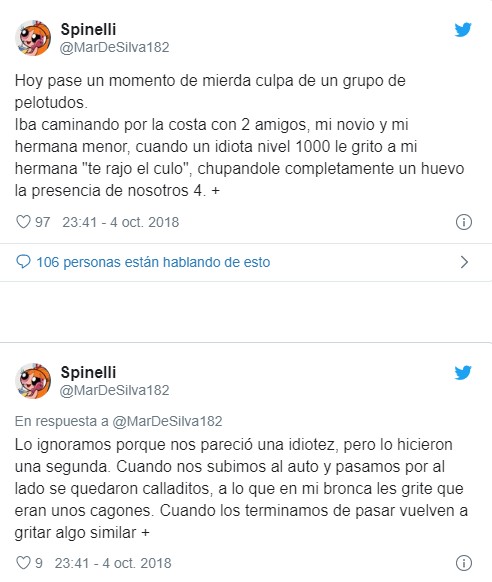 El episodio fue denunciado en las redes por la usuaria de Twitter @MarDeSilva182. En ese entonces, la joven contó que paseaba por la costa de Zárate junto con su hermana de 15 años y dos amigos, cuando el mismo Lucas habría cometido un acto de acoso callejero contra la chica menor de edad.