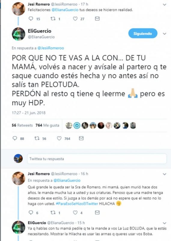 Pero eso no fue todo y la usuaria le retrucó: “Qué grande le queda ser la Sra. de Romero, mi mamá, quien murió hace dos años, le manda mucha luz a usted y sus criaturas. Penoso que una madre tenga deseos de ese estilo. Si juzga a los demás por acá no espere que el resto no lo haga con usted. #ParaEsoSeHizoElTwitter HILACHA”.