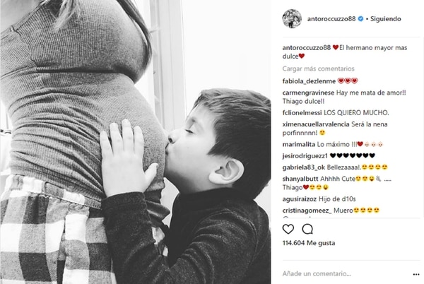 Este jueves, Antonela publicó una tierna imagen de Thiago dándole un beso a su panza esperando la llegada de su hermanito. “El hermano mayor más dulce”, escribió junto a la foto en la que ella luce un pantalón a cuadros y una musculosa, y el pequeño Thiago, una remera negra.