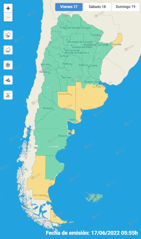 El Servicio Meteorológico Nacional (SMN) emitió esta mañana alertas amarillas para seis provincias del centro y sur del país que se verán afectadas por vientos intensos, especialmente en la zona costera de la provincia de Buenos Aires, mientras que en la provincia de Misiones es por lluvias y tormentas.