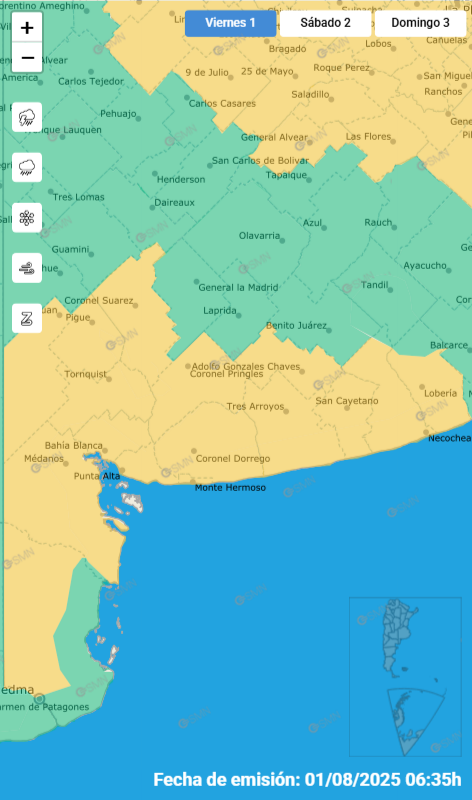 El alerta emitido incluye los distritos de Villarino, Coronel Rosales, Tornquist, Monte Hermoso, Puan, Coronel Suárez, Coronel Dorrego, San Cayetano, Lobería, Gonzales Chaves y Patagones, entre otros.