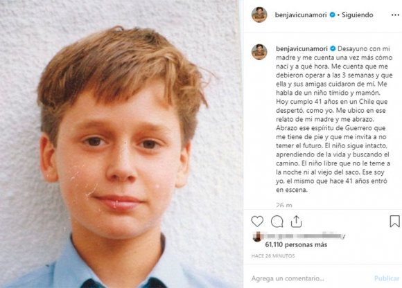 El actor publicó una foto de niño y escribió: “Desayuno con mi madre y me cuenta una vez más cómo nací y a qué hora. Me cuenta que me debieron operar a las 3 semanas y que ella y sus amigas cuidaron de mí. Me habla de un niño tímido y mamón. Hoy cumplo 41 años en un Chile que despertó, como yo”, haciendo referencia a la conflictiva situación que atraviesa su país.