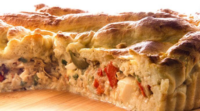 Para el relleno, mezclar los pescados en un bol, agregar la cebolla picadas y rehogar en oliva, el tomate cubeteado, morrón en tiritas previamente cocido a la hornalla, condimentar, aromatizar con ralladura de limón, huevo duro picado.