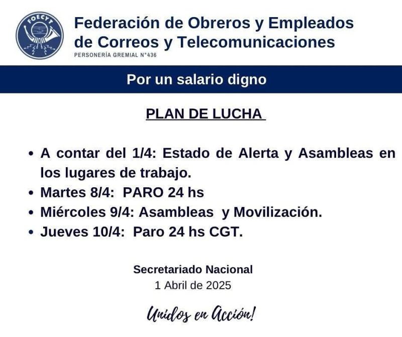 La Federación de Obreros y Empleados de Correos y Telecomunicaciones (FOECYT) confirmó que mantiene el plan de lucha en respuesta a “la decisión unilateral de la empresa de fijar un aumento salarial considerado insuficiente frente a la pérdida del poder adquisitivo”.